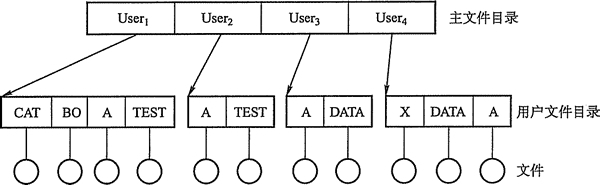 单级目录很容易造成文件名称的混淆,可以考虑釆用两级方案,将文件目录分成主文件目录(Master File Directory, MFD)和用户文件目录(User File Directory, UFD)两级,如图: