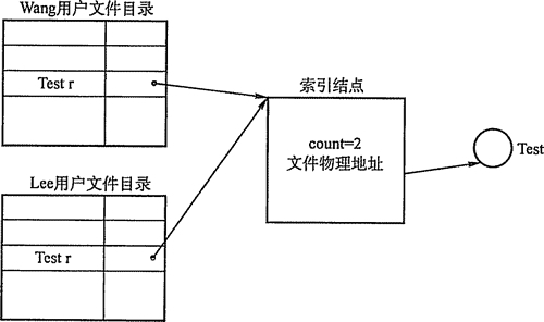 在这种共享方式中引用索引结点,即诸如文件的物理地址及其他的文件属性等信息,不再是放在目录项中,而是放在索引结点中。在文件目录中只设置文件名及指向相应索引结点的指针。在索引结点中还应有一个链接计数count,用于表示链接到本索引结点(亦即文件) 上的用户目录项的数目。当count=2时,表示有两个用户目录项链接到本文件上,或者说是有两个用户共享此文件。当count=0时,表示没有用户使用该文件,系统将负责删除该文件。