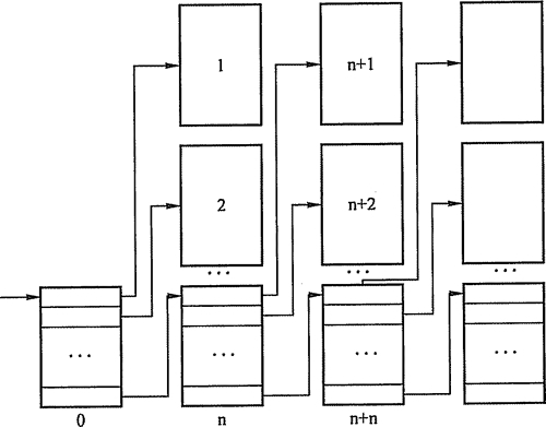 成组链接法:在UNIX系统中釆用的是成组链接法,这种方法结合了空闲表和空闲链表两种方法,克服了表太大的缺点。其将顺序的n个空闲扇区地址保存在第一个空闲扇区内,其后一个空闲扇区内则保存另一顺序空闲扇区的地址,如此继续,直至所有空闲扇区均予以链接。系统只需要保存指向第一个空闲扇区的指针。通过这种方式可以迅速找到大批空闲块地址。如图: