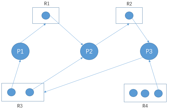 上图是一个带有死锁的资源分配图,因为P2想要R2,R2又给了P3,P3又想要R3,可是2个R3在P1和P2手里。