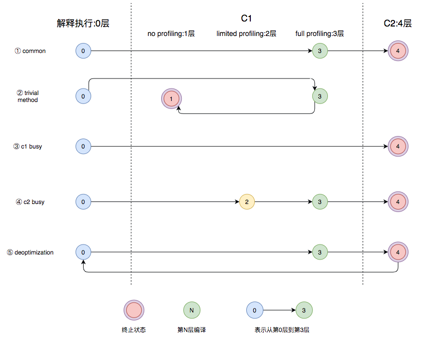 正常的编译路径是这样的,先解释执行(0层)、再使用C1编译执行并带所有的profiling(3层),最后再使用C2编译执行(4层)。但是,