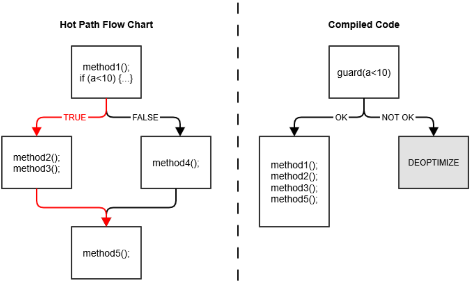 - 如果C2做了一些比较激进的优化,比如分支预测,然后在实际执行中发现预测出错,这个时候就会进行「去优化」,重新进入解释执行。如下图,在运行过程中,编译器发现a总是小于10,一直在走左侧红色分支。此时,编译器就会笃定未来大概率还是走这个分支,于是就会省去