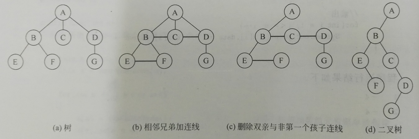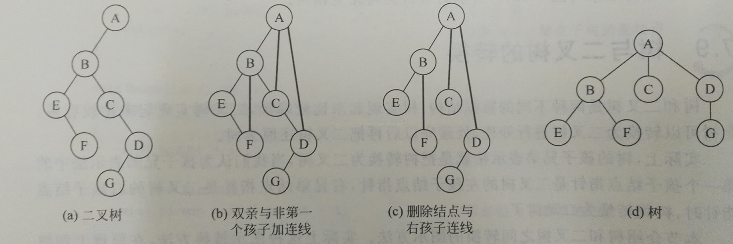 - 对树中不是双亲结点的第一个孩子的结点,只保留新添加的该结点与左兄弟结点之间的连线,删去该节点与双亲结点之间的连线