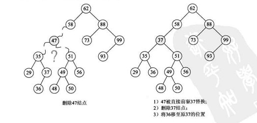 当被删除的结点不在终端结点时,假定被删除的关键字为K,有如下情况: