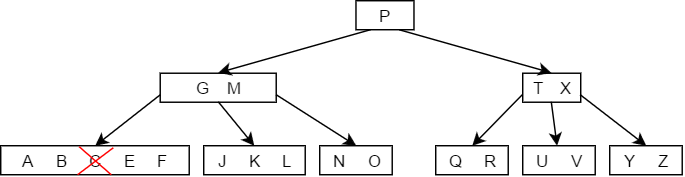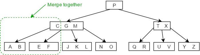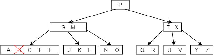 - 当被删除的关键字所在结点删除前关键字个数恰好等于,且此时与此结点相邻的左右兄弟结点的关键字个数也等于,此时左右兄弟不够借了,那么就需要将关键字删除后与右(左)兄弟结点及双亲结点中的关键字进行合并,如下图删除关键字B的过程: