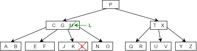 - 如果大于K的子树中关键字的个数大于,则找出K的后继值,用其后继值来代替K,如下图中删除结点G的过程: