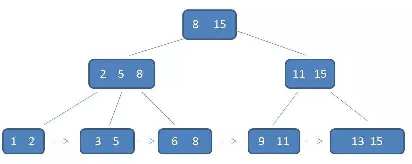 - 所有叶结点包含全部关键字及指向相应记录的指针,而且叶结点中将关键字按大小顺序排列,并且相邻叶结点按大小顺序互相用指针链接起来。