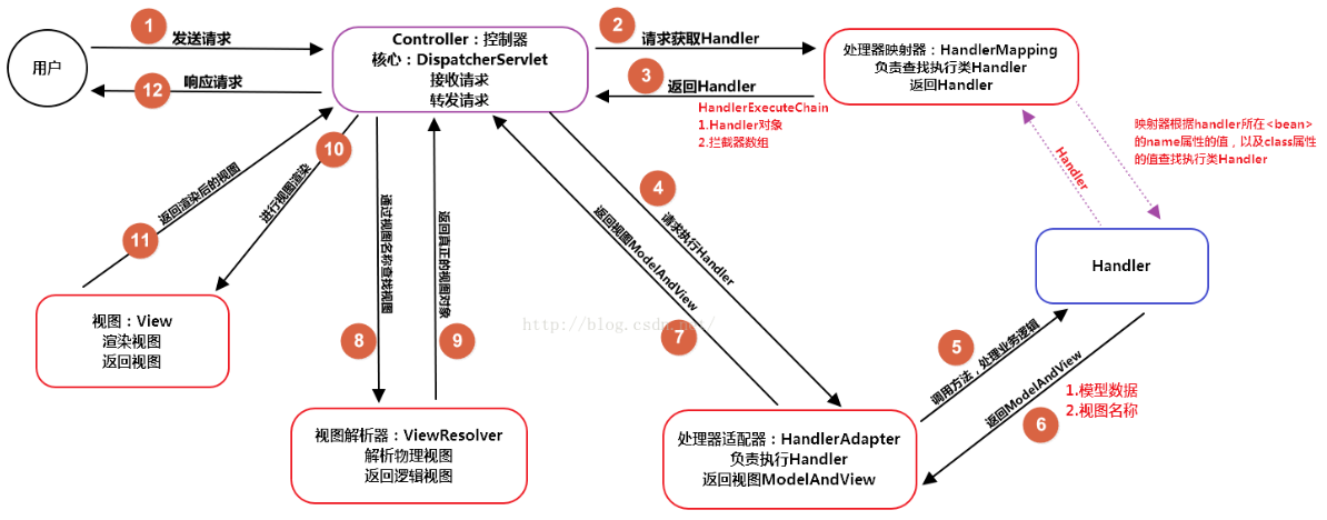 客户端发送请求 -> 前端控制器DispatcherServlet接受客户端请求 -> 找到处理器映射HandlerMapping解析请求对应的Handler -> HandlerAdapter会根据Handler来调用真正的处理器开始处理请求,并处理相应的业务逻辑 -> 处理器返回一个模型视图ModelAndView -> 视图解析器进行解析 -> 返回一个视图对象 -> 前端控制器DispatcherServlet渲染数据 -> 将得到视图对象返回给用户。