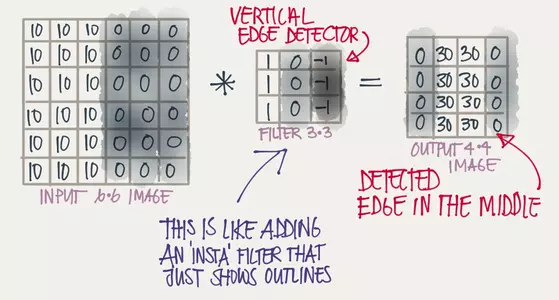 这样做的意义在于可以清晰地划分出图像轮廓,例如在下图中,原矩阵在中间有一条明显的竖直轮廓,轮廓左边是10右边是0,在通过一个3x3的矩阵卷积后得到的结果中,这条轮廓被明显地表示出来了: