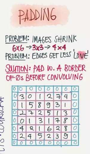 在上面的例子中,一个6x6的输入矩阵在3x3的卷积矩阵的作用下得到的结果是一个4x4的矩阵,如果我们想让结果矩阵和输入矩阵一般大,那我们就需要用到填充(Padding),一般我们使用的方法为SAME Padding,即为在原矩阵外面包裹一层0,如下: