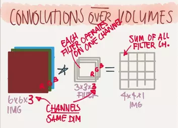 当我们对彩色的训练图片进行处理的时候,所有的色彩都可以由RGB三原色组成,因此我们对彩色图片使用卷积神经网络训练时,往往使用三个通道来对每个颜色进行过滤。于是一个长宽各为6个像素的彩色图片,可以表示为一个6x6x3的3D物体,然后我们使用3x3x3(最后一个3代表通道数)来进行卷积,卷积后将3个通道内的元素相加将其最终合并为1张输出层图片,由此我们将得到一个4x4x1的输出层图片。此时输出层的深度(depth)即为1。如图: