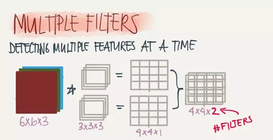 增加卷积核的个数即可增加输出层图片的个数,例如下图中一个6x6x3的输入层图片在2个3x3x3的卷积核的作用下可以得到两个4x4x1的输出层图片。