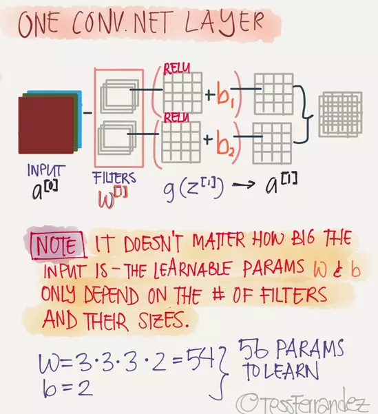 之前我们所创造的全连接神经网络,通常需要一个线性函数()和一个激活函数共同作用,CNN也是如此,通常在滤波器之后还要加一个激活函数(在图像识别中一般使用Relu函数),CNN中的线性函数同样需要一个权重项W以及一个偏置项b,在CNN中一般使用滤波器的数值作为W,偏置项b一般加在Relu函数之后。如下图所示: